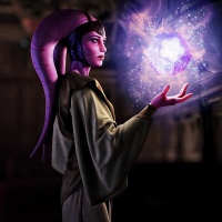 particular scene, the Twi'lek is focused on an object they are holding with both hands. The object seems to be a form of crystal or energy orb that emits a glowing purple light, suggesting it may have