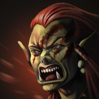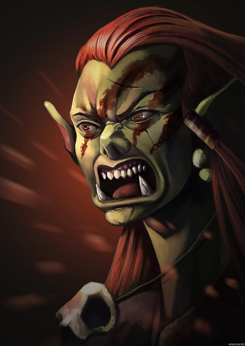 an animated character that resembles an orc from fantasy genres. It features a humanoid creature with red skin,