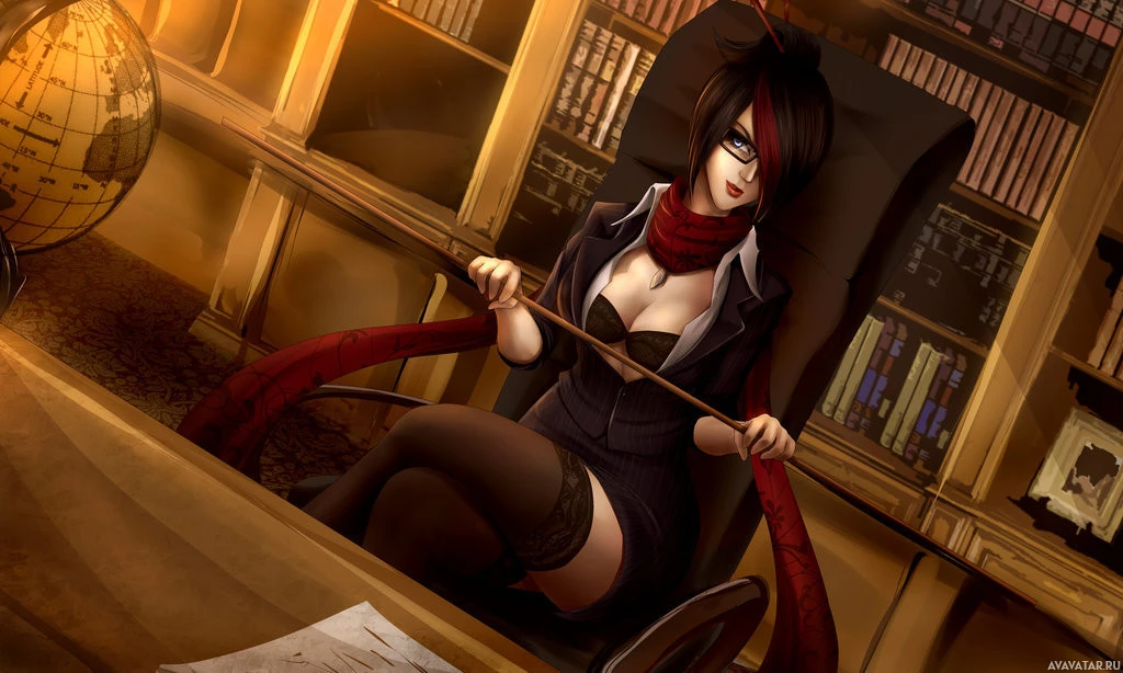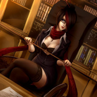 black hair, wearing glasses and a dark-colored outfit that includes what looks like a jacket or coat. She is sitting at a desk in front of books, suggesting