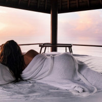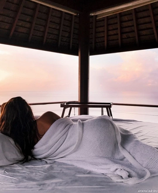 a view of the ocean at sunset. The person appears to be wrapped in a blanket, and their head is resting on a pillow. They have