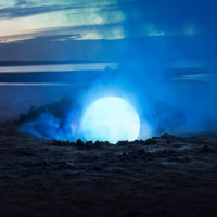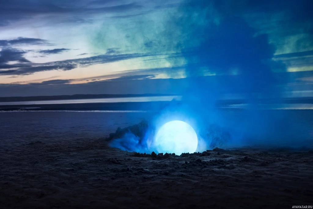 a natural phenomenon where light is being emitted from the ground, possibly due to bioluminescent algae or bacteria in the sand. The light appears as blue and green hues against