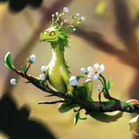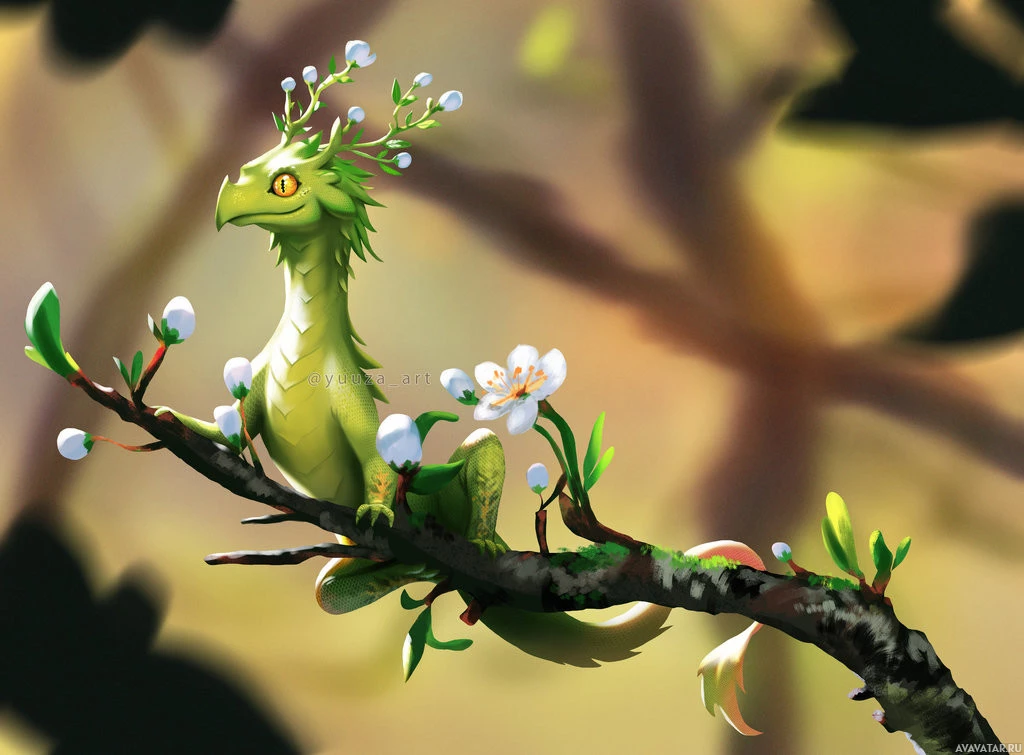 a fantasy creature that resembles a dragon, sitting on a branch of a tree. This creature has a serpentine body with scales and