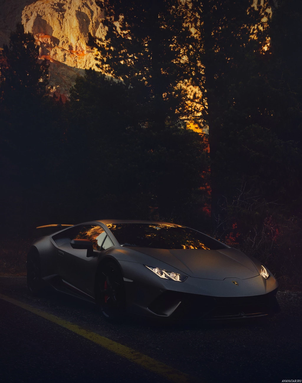 a setting sun or low light. The car is a modern, high-