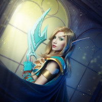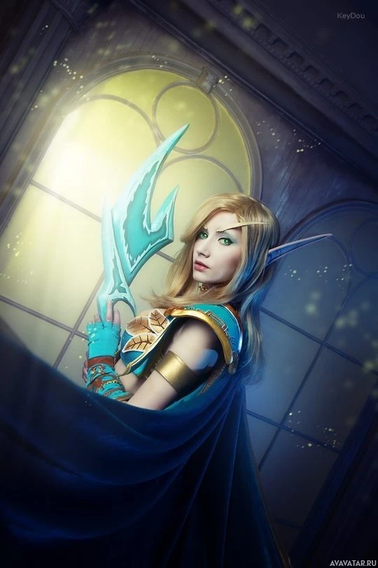 Картинка показывает женского персонажа, который кажется эльфом из фэнтезийной игры или косплея. Она держит в руках синее оружие, напоминающее Глейв из Приливов, известный артефакт, связанный с серией Warcraft. Персонаж имеет светлые волосы и носит доспехи с дизайном, который предполагает, что она может быть частью фракции, известной своей связью с магией и природой. Её поза и выражение лица говорят о том, что она готова к бою или приключениям.