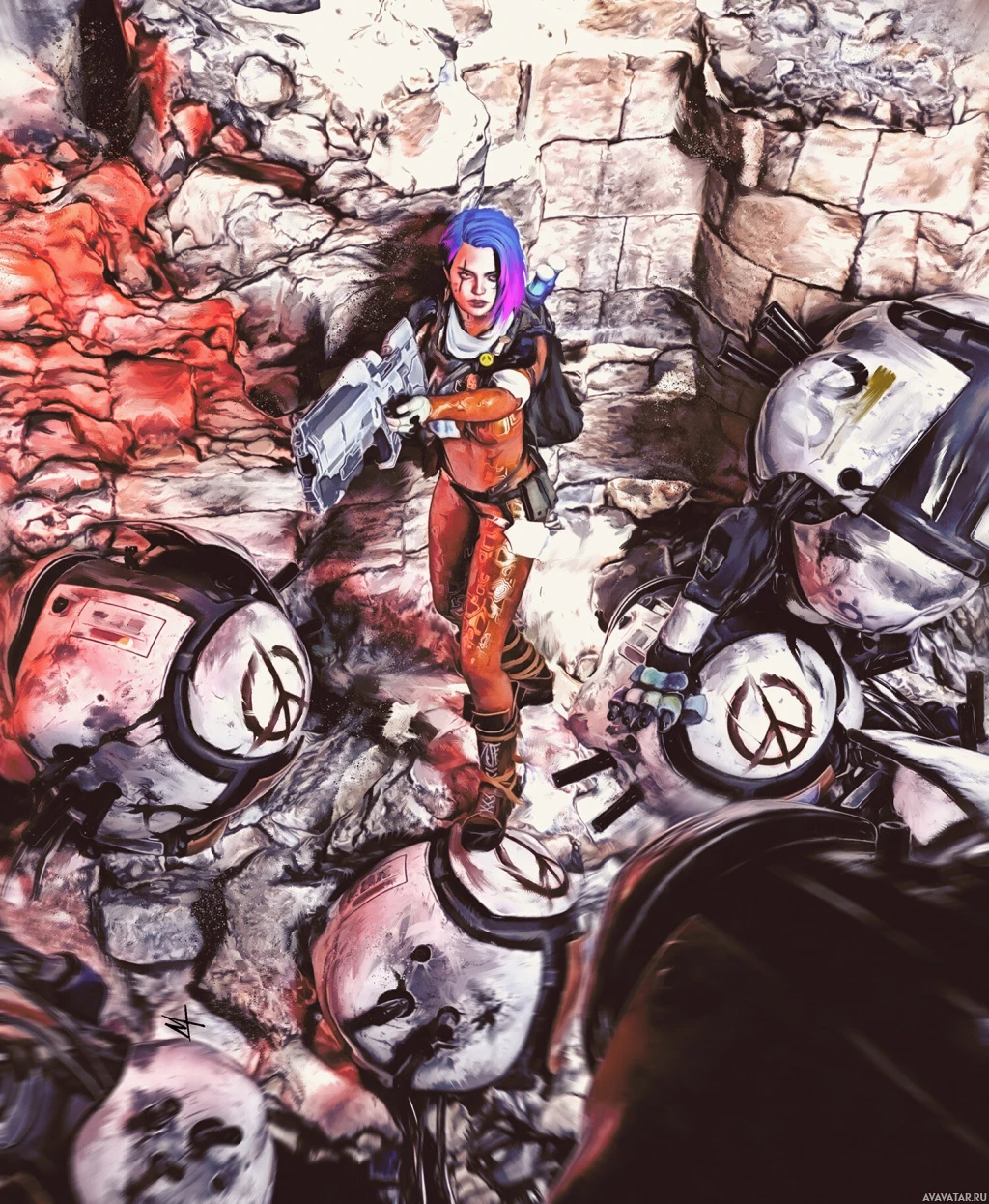blue hair standing amidst what appears to be a battlefield or wreckage. The character is equipped with a weapon and is surrounded by large metallic objects that could be armor, weapons, or debris from the conflict. The setting has a post-apocalyptic or war-torn aesthetic.