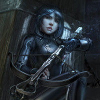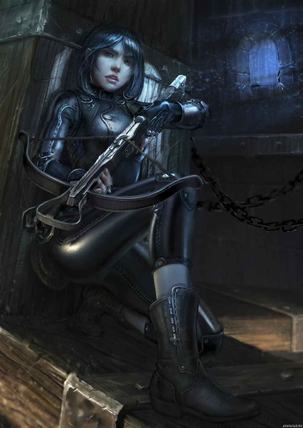 a black outfit that looks like armor or a costume, which includes a bodysuit with intricate details, leather elements, and boots. She's holding what seems to be a crossbow with the string drawn back, ready for use. The setting suggests
