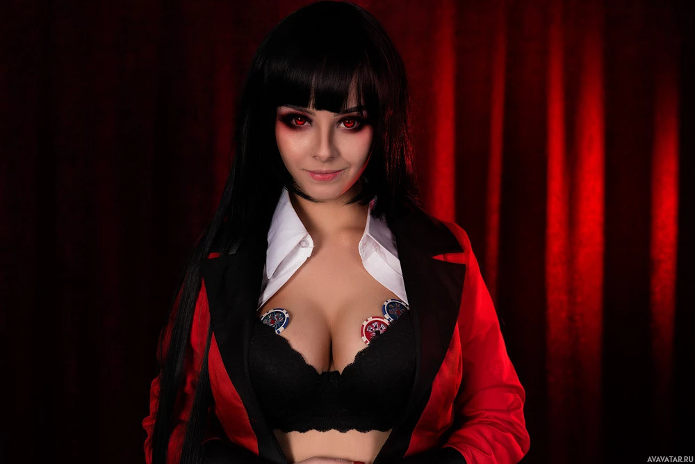 The image features a person with dark hair wearing an outfit that includes a red and black top, likely inspired by a character's costume from the "Bloodborne"
