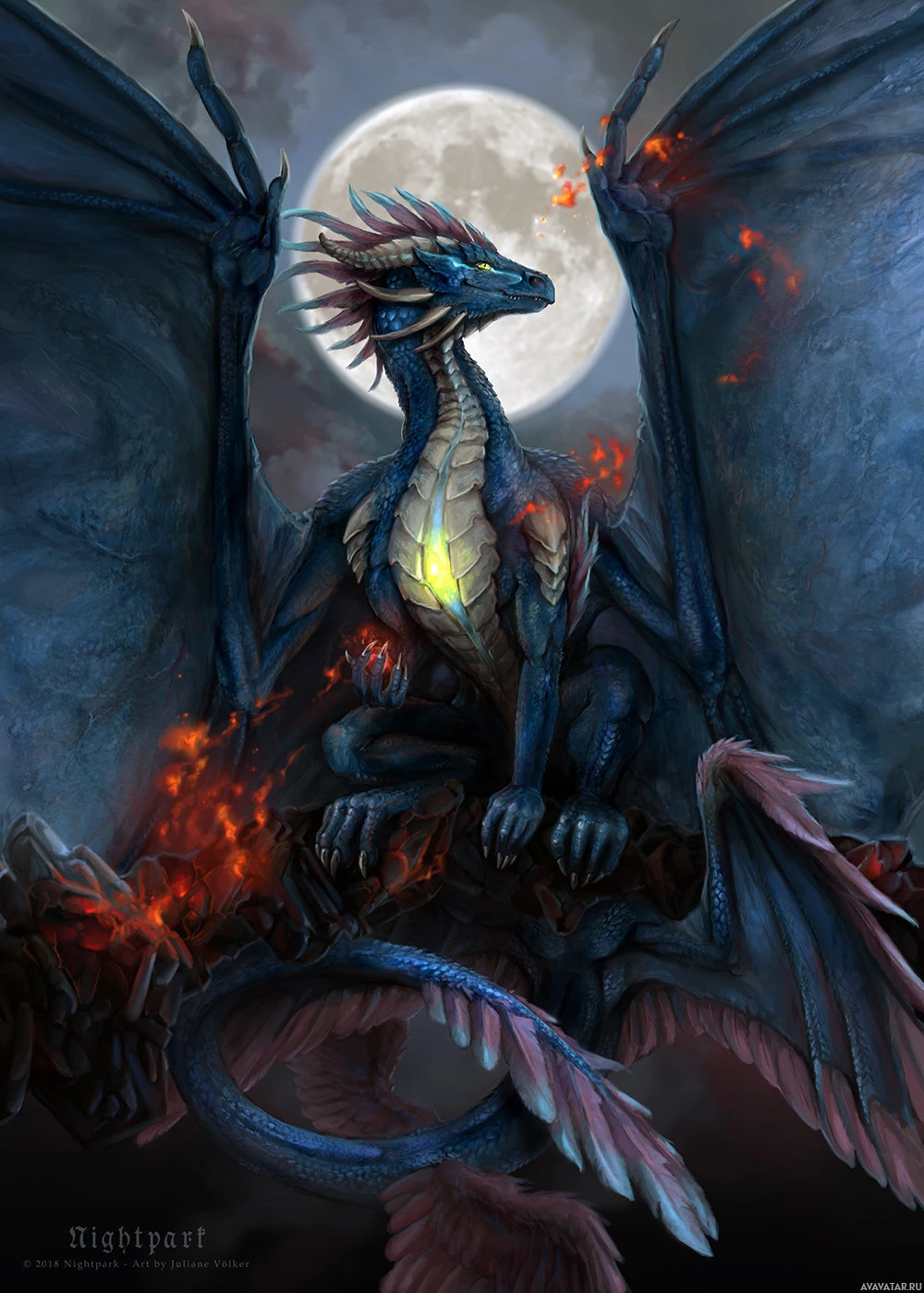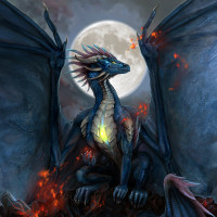 The image shows a digital artwork of a fantasy-style dragon. The dragon has blue and purple scales, with flames surrounding its body, suggesting it might be