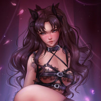a revealing outfit that includes elements like chains and straps, which gives it an erotic or fetishistic appearance. The background has a purple color scheme with what appears to be