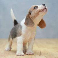 На картинке изображена маленькая собака с гибкими ушами, что характерно для породы, широко известной как бигль. Кажется, что он стоит в помещении на деревянном полу, и его выражение кажется довольным или любопытным.