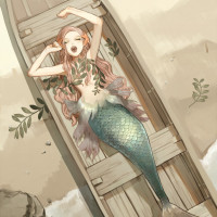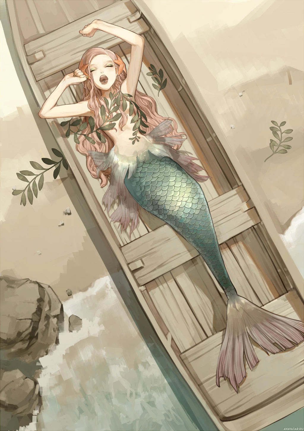flowing hair in shades of pink and purple. The mermaid is lying on her back on a boat, with her tail draped over the edge. There are