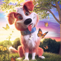 In the image, there is a cartoon depiction of a dog. The dog appears to be sitting on grass with trees and a beautiful sunset in the background. It has its tongue sticking out and seems to be panting or smiling. There are colorful butterflies flying around it, adding a whimsical touch to the scene.