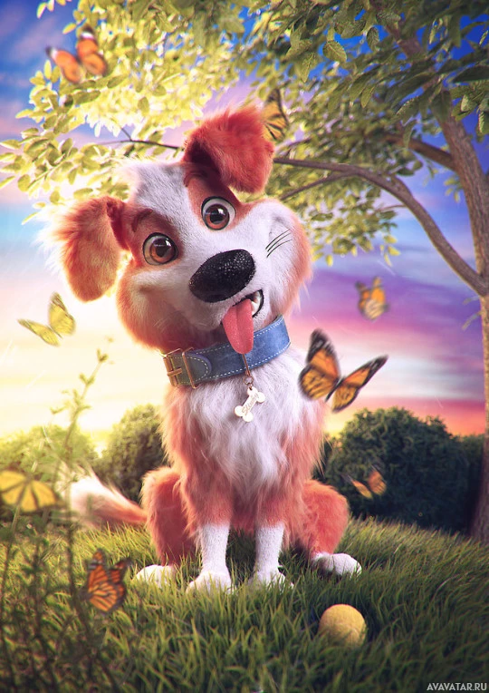 На картинке присутствует карикатурное изображение собаки. Собака, кажется, сидит на траве с деревьями и красивым закатом на заднем плане. У него торчит язык и, кажется, он стучит или улыбается. Вокруг него летают красочные бабочки, добавляющие причудливое прикосновение к сцене.