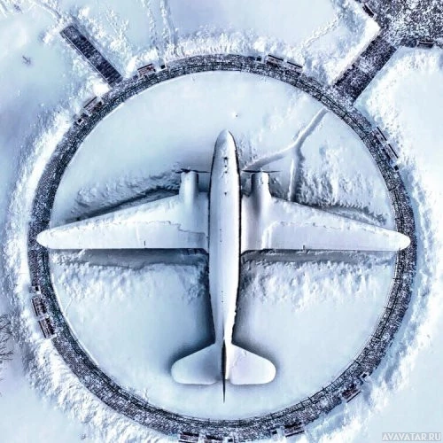 На снимке изображен большой реактивный самолет, вероятно, Boeing 747, сидящий на заснеженной взлетно-посадочной полосе. Взлетно-посадочная полоса спроектирована таким образом, что образует форму воздушного винта вокруг самолета. Это создает визуальный каламбур или элемент дизайна, где пропеллеры самолета подразумеваются как часть окружающей среды, интегрируясь в снежный ландшафт.