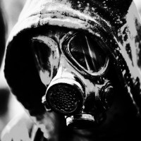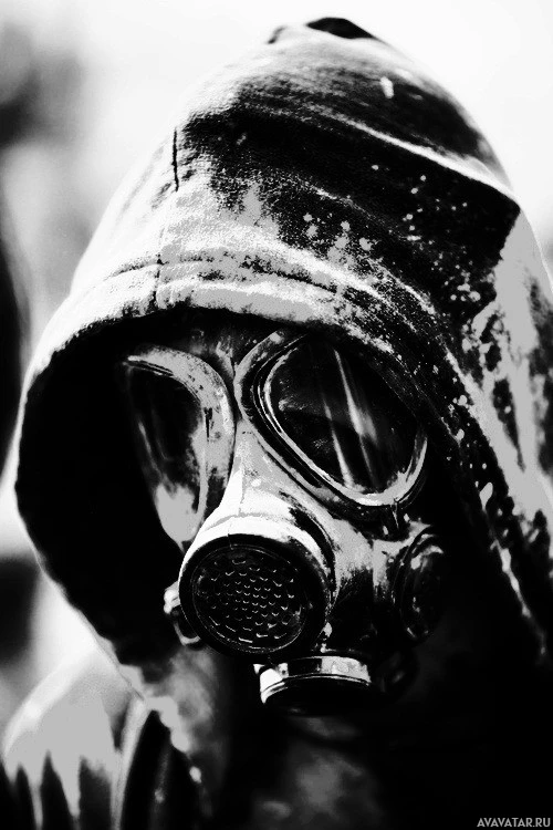 In the picture, there is a person wearing a hood and respirator. The person's face is obscured by the hood, which covers their head and shoulders. They are looking downwards, and it appears that they might be standing outdoors in