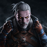 The image shows an artwork of Geralt of Rivia, a character from