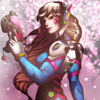 a serene setting, possibly cherry blossoms, contrasting with D.Va's combat-ready appearance.