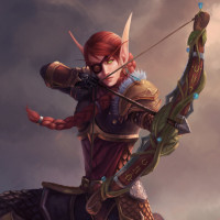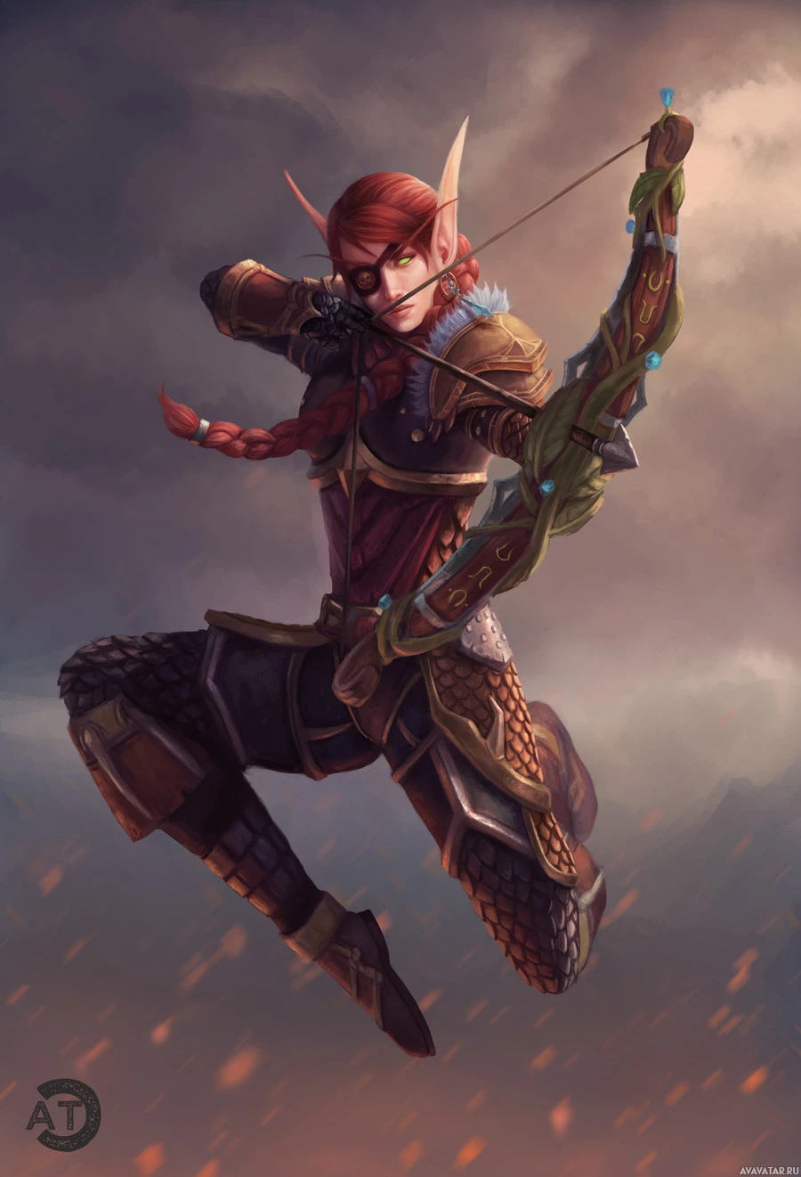 На картинке изображен иллюстрированный персонаж, который кажется фантастическим лучником. Этот человек имеет рыжие волосы и носит доспехи со средневековым или фантастическим дизайном. Они держат лук и стрелы, что говорит о том, что они могут готовиться к бою или охоте. Фон создает впечатление поля битвы или напряженной ситуации, обозначенной темными облаками и пламенем вокруг.