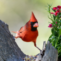 bright flowers around it, which are likely attracting other birds as well. There's also a wooden fence structure visible in the background.