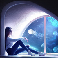 small table, but the focus is on the window. Outside the window, we see various jellyfish floating in a dark