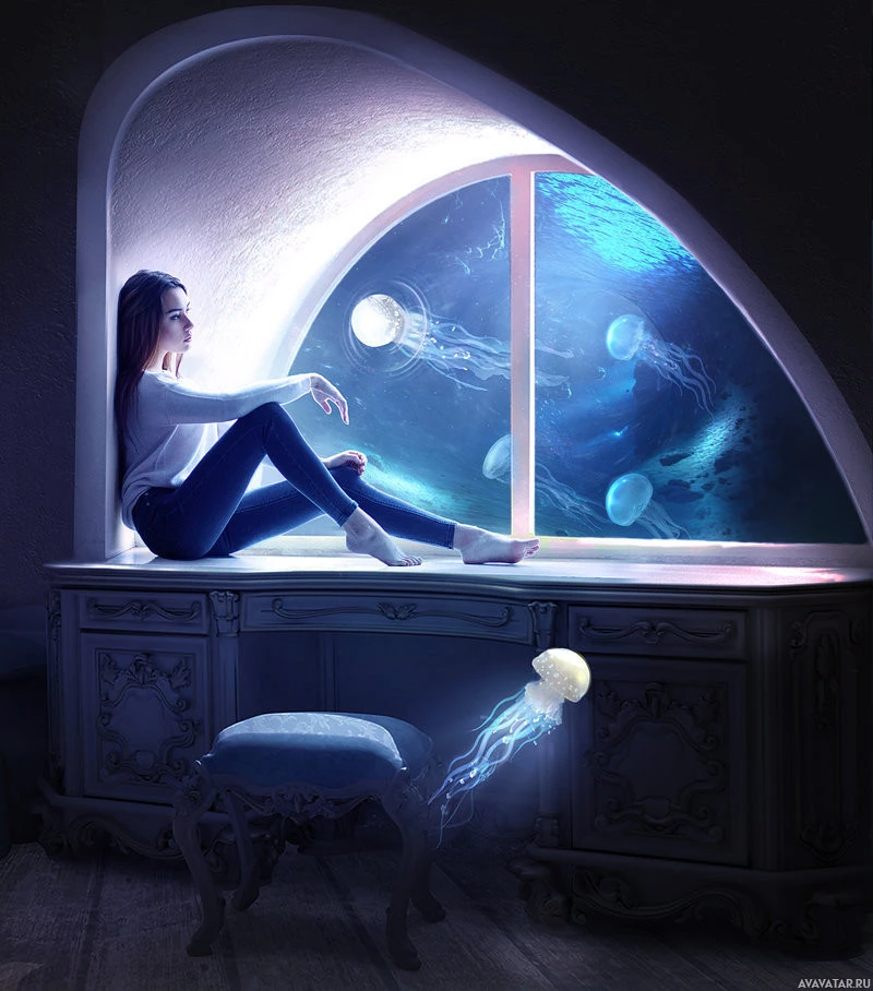 a young woman sitting by an open window that offers a view of a magical underwater world. Inside the room, there are drawers and what appears to be a stool or