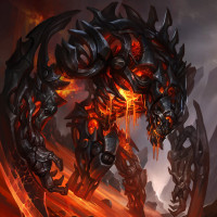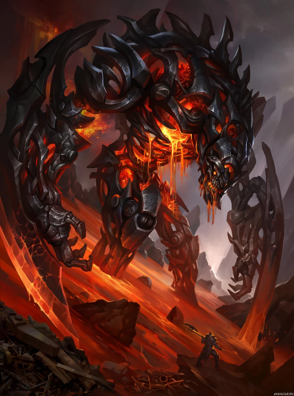 molten lava or magma, indicating a volcanic or infernal setting. The artwork showcases a dramatic and intense atmosphere, characteristic of