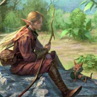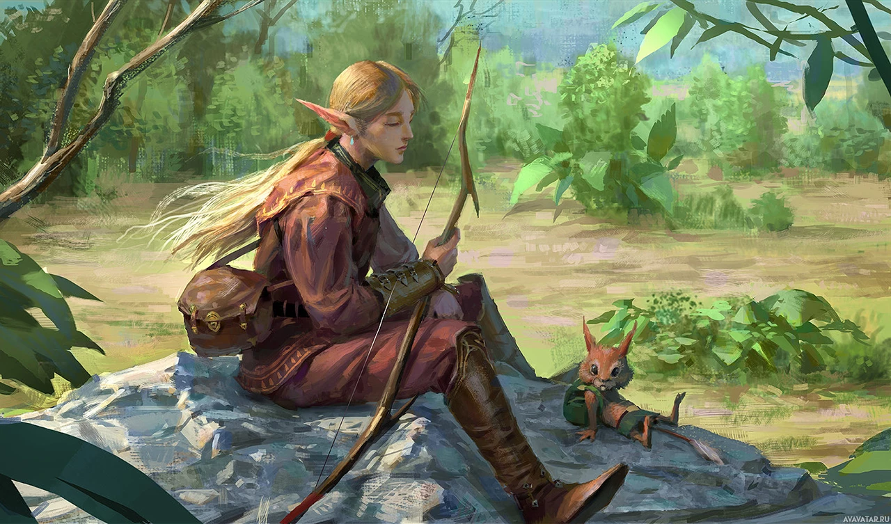 Картинка показывает фантастическую сцену с эльфом. Эльф сидит на скале среди естественного окружения, с лисой у ног. Они держат лук и, кажется, находятся в глубоком созерцании или, возможно, ожидают чего-то. Фон предполагает лес или пустыню, повышая спокойствие сцены.