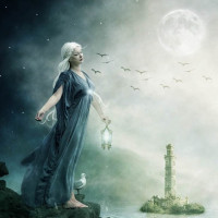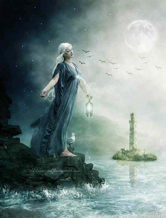 a body of water where there's a small boat and a lighthouse in the background. The person is holding a lantern, which suggests she might be searching for something or guiding someone. The moonlit night and the presence of birds in flight add to