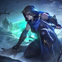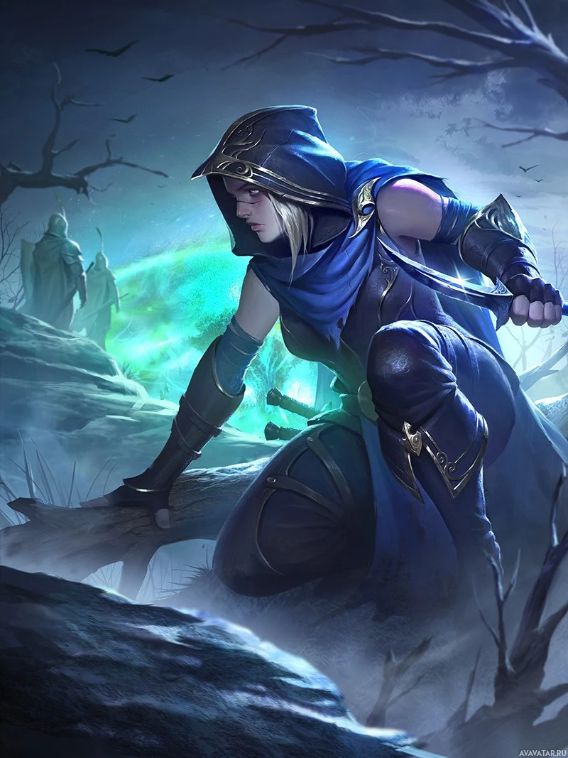 The image depicts a character dressed in a cloak and holding a bow. The setting appears to be a forest or