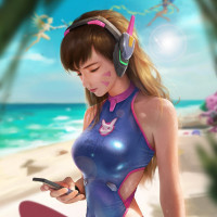 animated look. D.Va is wearing a futuristic, space-themed swimsuit with pink and blue accents. She has