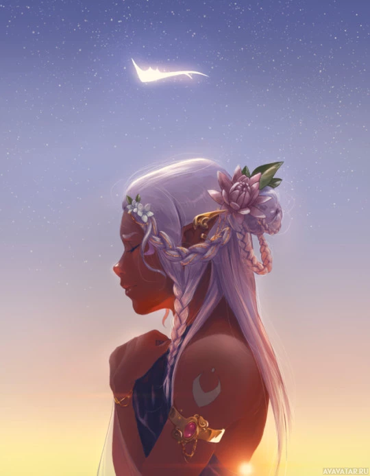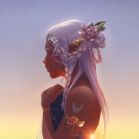 silver hair, and there is a flower in their hair. They are wearing what appears to be armor with a moon-like