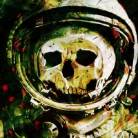 The image depicts a skull wearing an astronaut's helmet and suit. This is an artistic representation combining elements of mortality (the skull) with the theme of