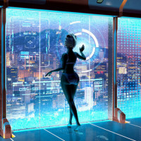 the sleek design and digital displays in the background. The color palette is predominantly blues and purples, giving it a cool and high-tech atmosphere. The environment suggests