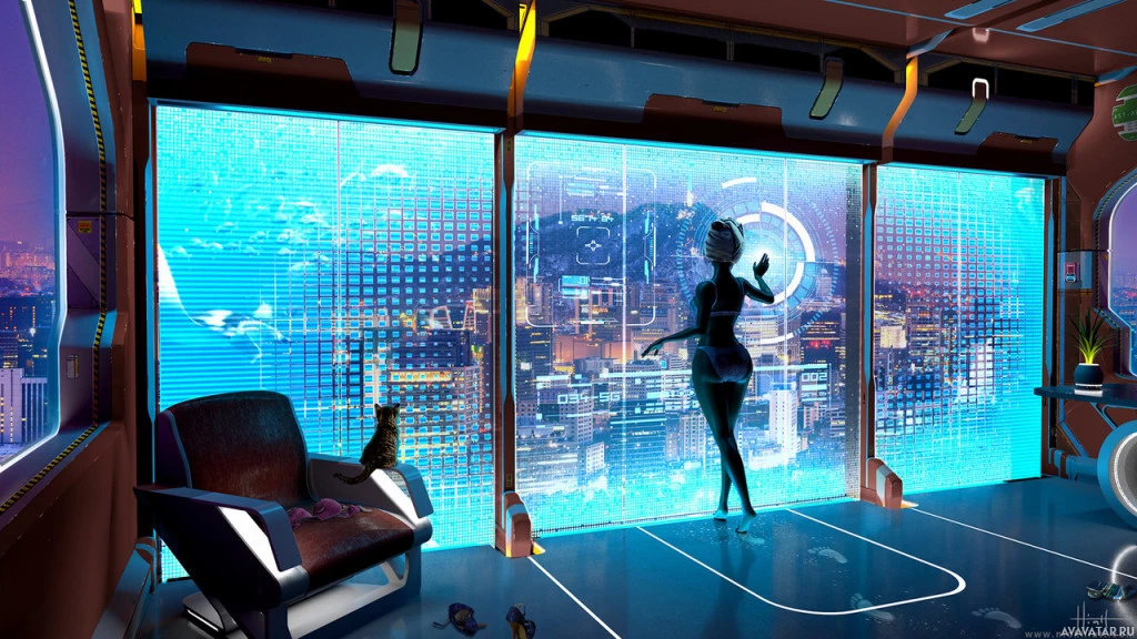 a science fiction scene with a silhouette of a girl from behind. She appears to be inside a futuristic vehicle or spacecraft, as indicated by
