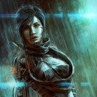 a science fiction context. She is standing in the rain, with a determined or contemplative expression on her face. The character has a distinctive hairstyle and is wearing what seems to be armor, suggesting she might be part of a military or special forces unit within this