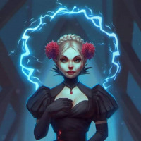 blonde hair, is wearing a black dress with puffy sleeves and a high collar, and has dark gloves on her hands. On her head, there are two