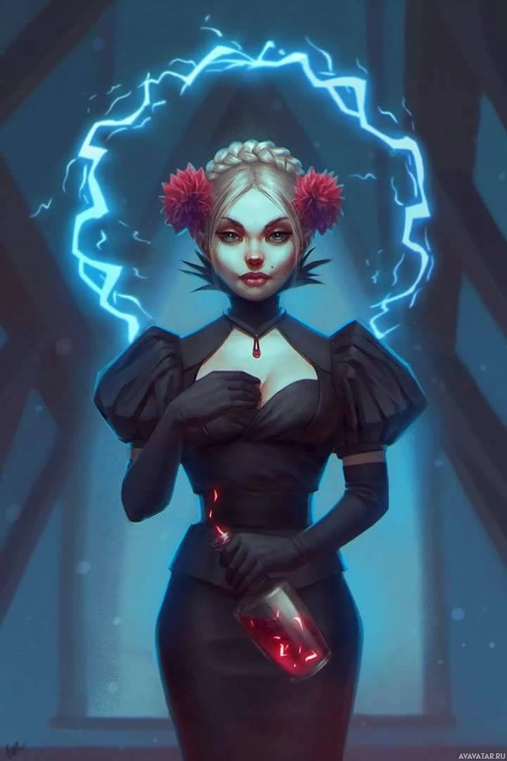 large flowers that look like they might be made of blood or have some sort of eerie appearance. In her right hand, she holds what appears to be a small bottle or flask with