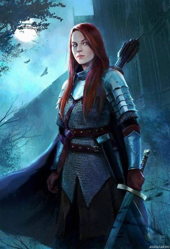 The image depicts a woman dressed in what appears to be armor, suggesting she may be from