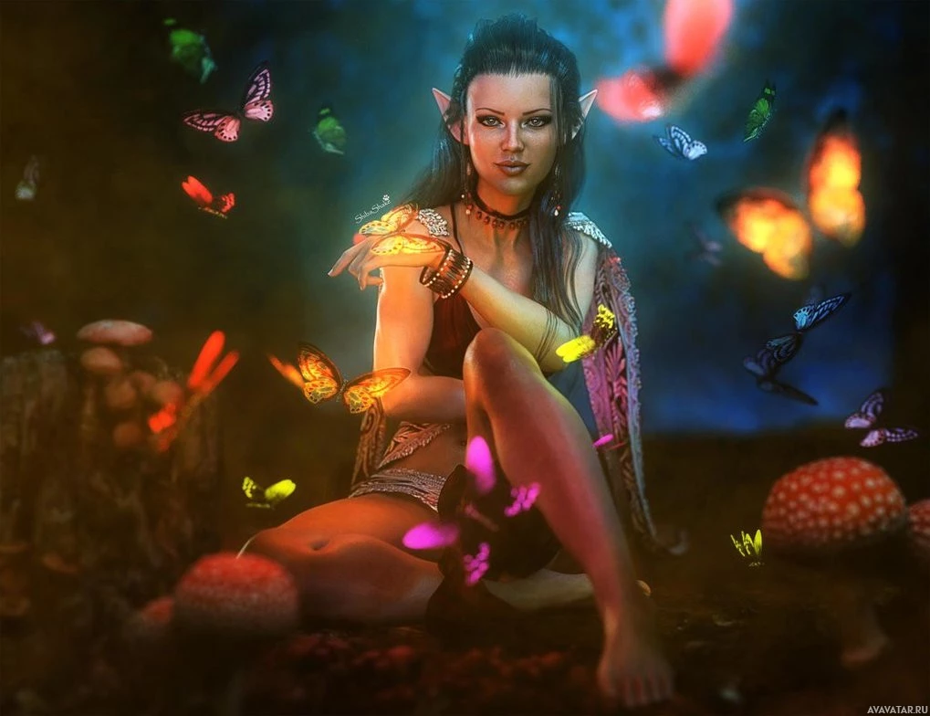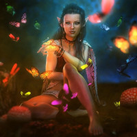 mystical atmosphere of the image. The style of the artwork is highly stylized and colorful, with a focus on fantasy elements that evoke a sense of enchantment and otherworldliness. The use of light and shadow creates depth in the image, highlighting the character as the central focus amidst the flurry of butterflies and mushrooms.