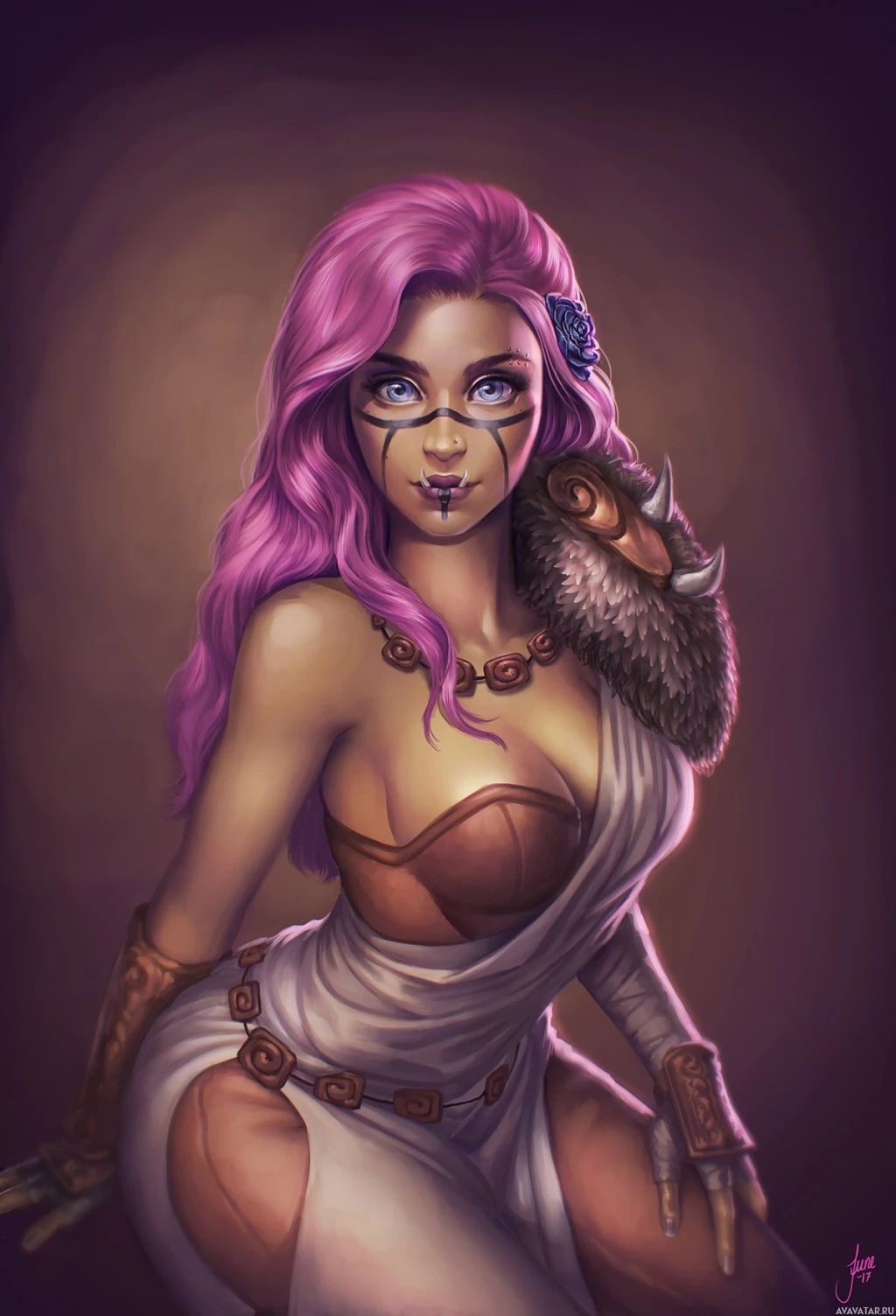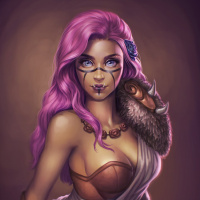 female character with pink hair. She is depicted in a fantasy or perhaps