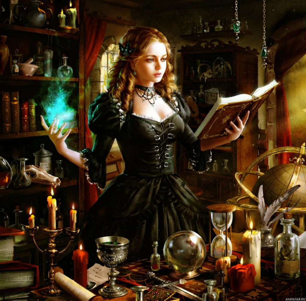 various objects like books, candles, bottles labeled "magic" and "elixir," indicating a theme related to mysticism or alchemy. The atmosphere is one of enchantment and the artwork conveys