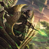 magical energy emanating from their hands. The background is filled with dense foliage and a backdrop of twilight sky, which adds to
