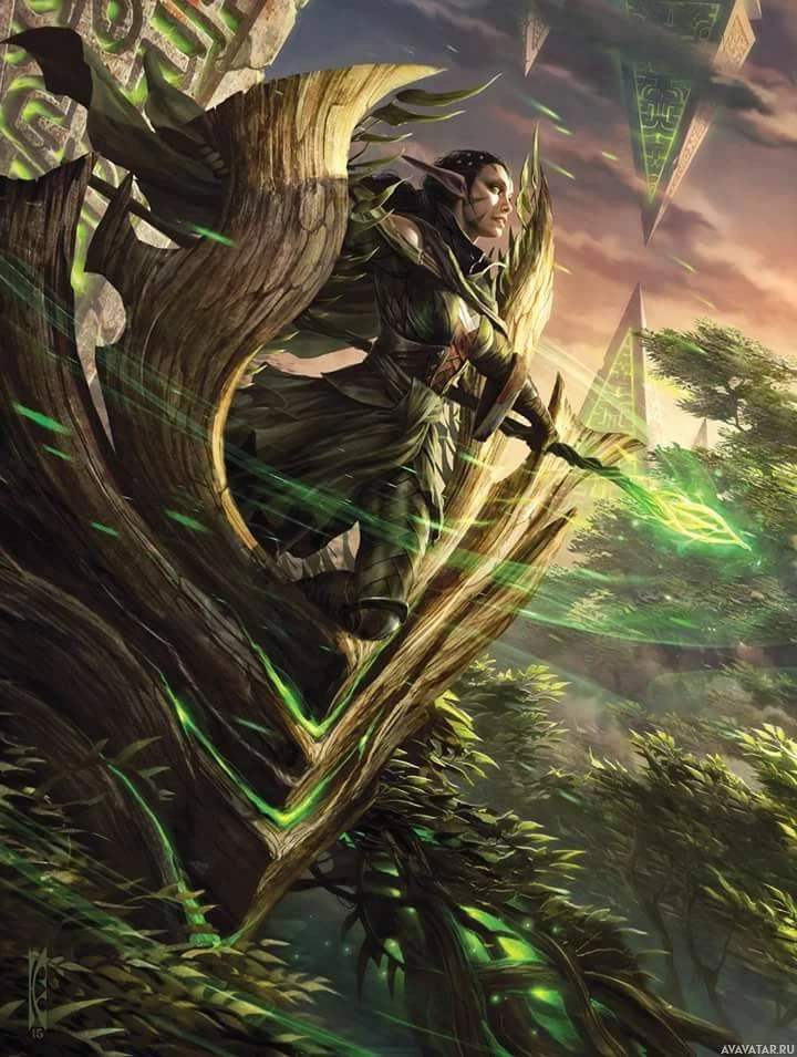 a fantasy scene featuring an elf character. The elf is riding atop a large, leaf-covered branch that emerges from the ground, surrounded by greenery and what appears to be