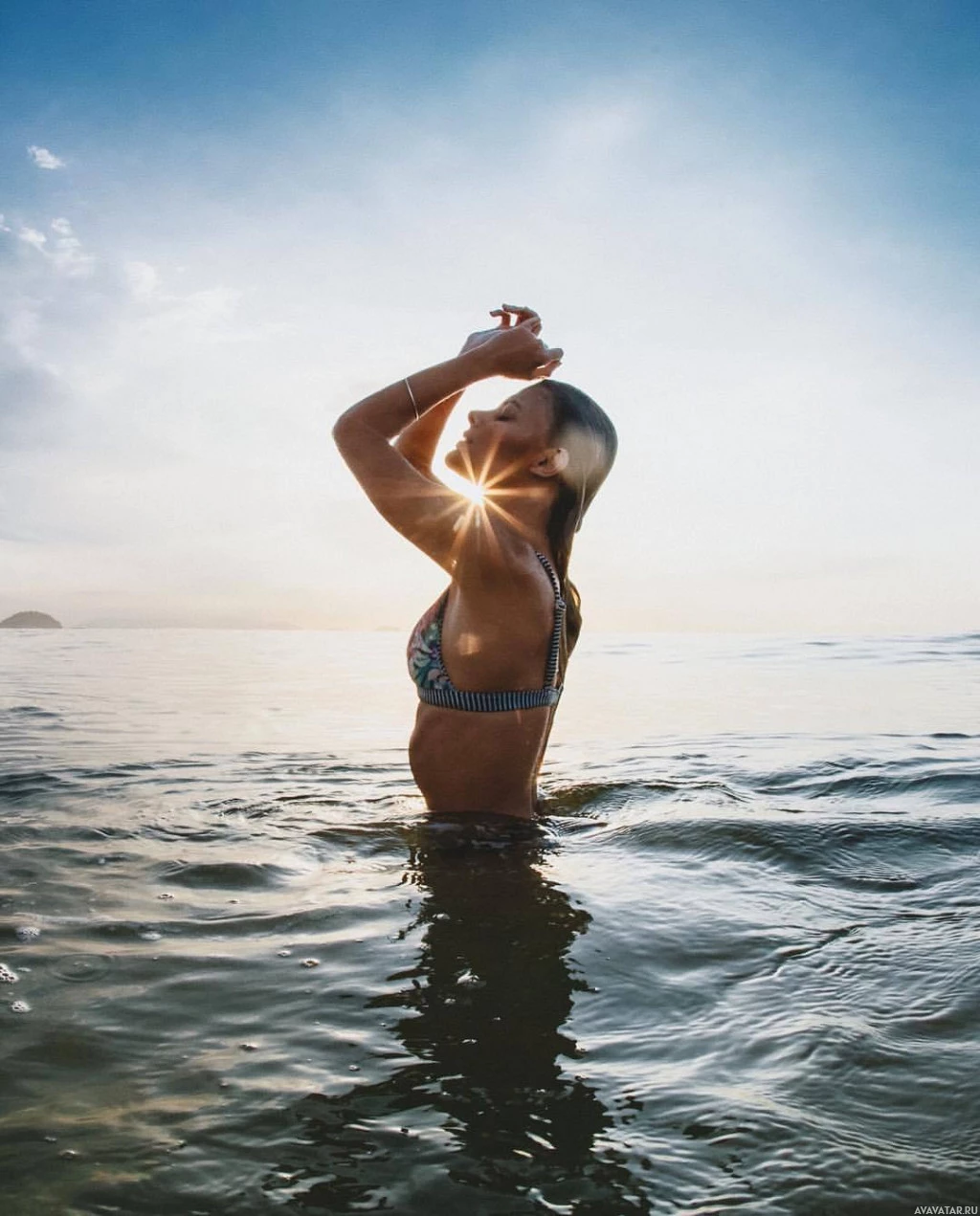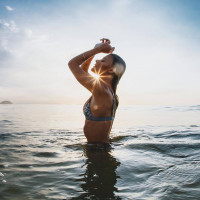 На снимке изображена женщина в океане во время заката. Она носит бикини и, кажется, наслаждается, когда смотрит на небо, возможно, на теплые цвета заходящего солнца, отражающиеся от ее кожи или на водную поверхность вокруг нее.