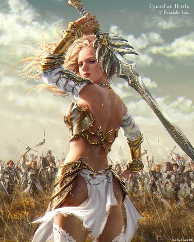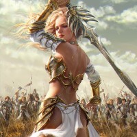 a female character in a fantasy setting. She is wearing armor and holding a sword, with a determined expression on her face as she appears to be facing an enemy or preparing for battle. In the background, there are figures that look like soldiers or warriors, suggesting