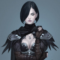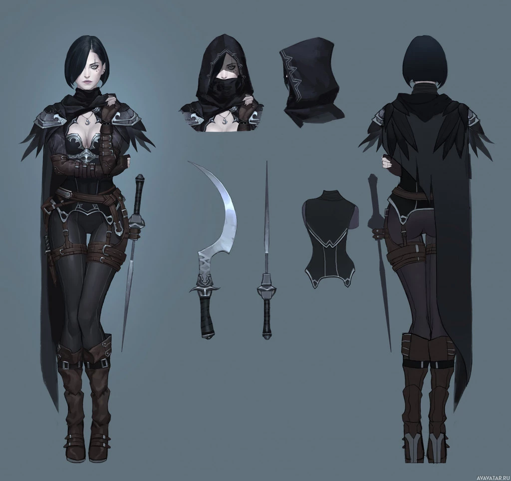 a female warrior or rogue, dressed in armor with a skull mask that covers her face. She is wearing a cape and carrying a sword on her hip. The character's attire suggests she might have a dark, ominous theme associated with her persona.