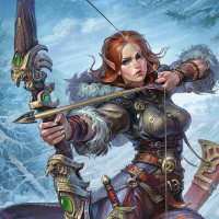 The image features a fantasy character who appears to be an elf. She has red hair and is wearing armor, suggesting she might be a warrior or a hunter. In her hands, she holds a bow which she is using to aim at something in the distance. The setting seems to be a snowy landscape, possibly during winter, with trees around her.