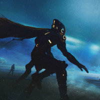 The image appears to be a screenshot from a video game. It shows a character in the foreground looking at another figure in the distance, which could be a companion or an opponent. The setting seems to be a dystopian or post-apocalyptic environment, with industrial structures and debris scattered around. The atmosphere is desolate, suggesting it could be a scene from a science fiction game.