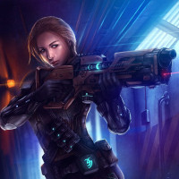 looking weapon, which could be a rifle given its design and the way she's gripping it. Her outfit has a high-tech appearance, featuring intricate designs and possibly