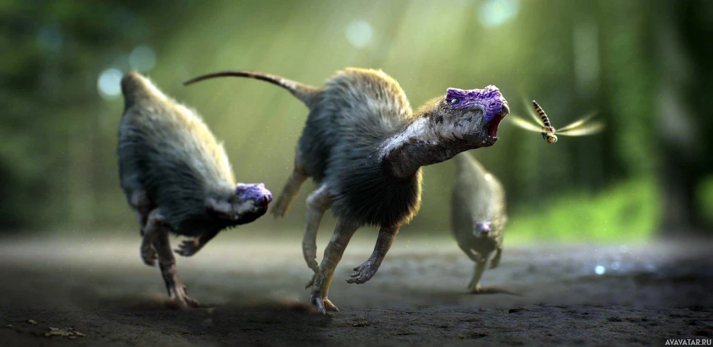 a serene atmosphere. On the right side of the image is a scene that looks like it's from a movie featuring what appears to be a T-Rex or another similar prehistoric animal chasing after what seems to be